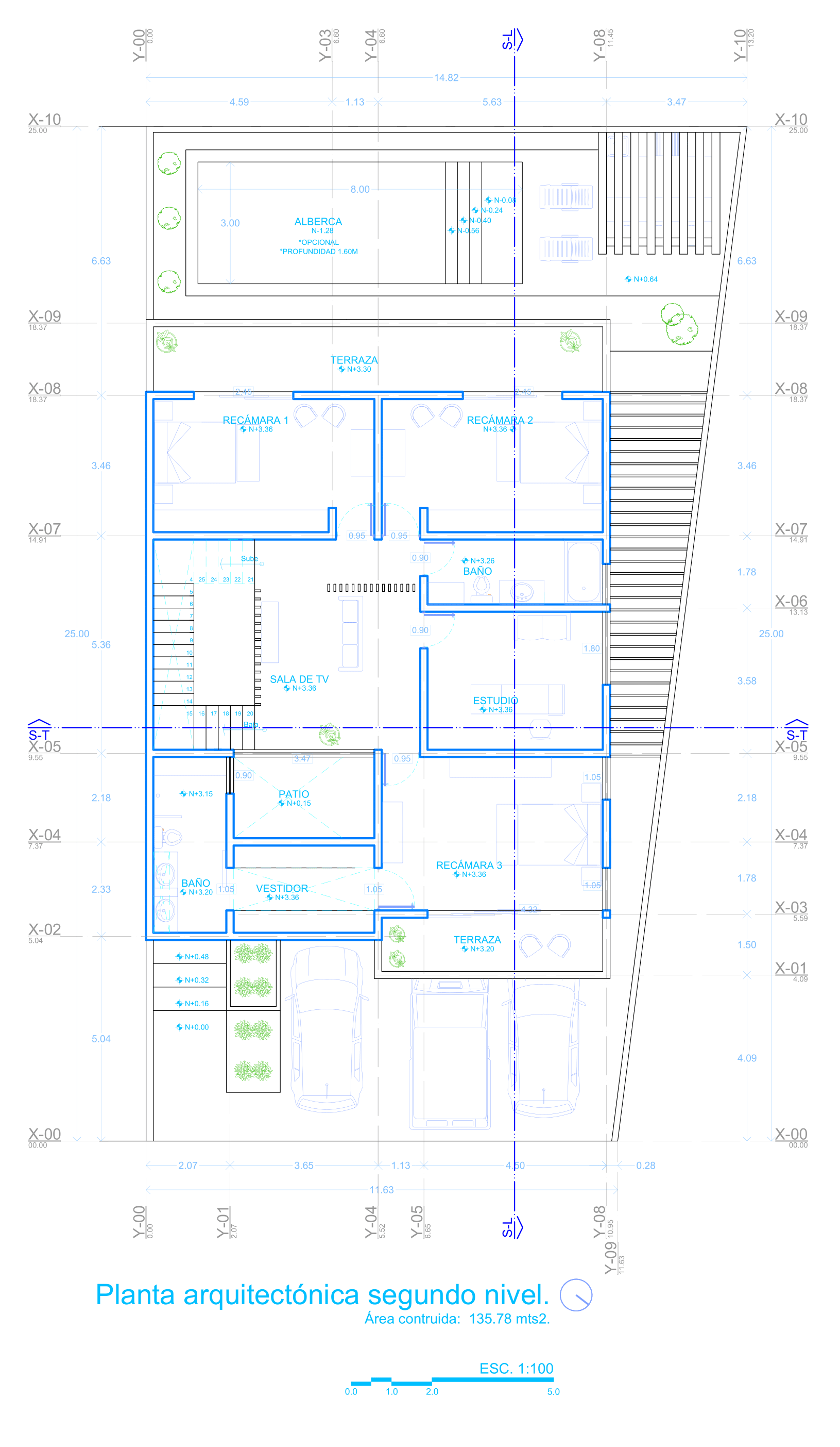 El proyecto se compone por dos volúmenes principales, de lado derecho sobresale un módulo el cual tiene la funcionalidad de terraza. En el se encuentra un pergolado de madera lo que se convierte en un atractivo visual, además de permitir iluminación y ventilación natural a la recámara principal.